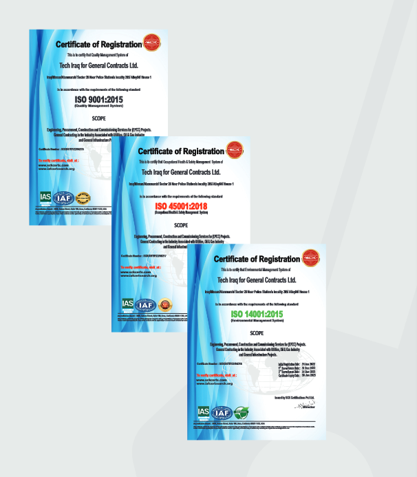 In Iraq’s demanding general contracting sector, Tech-Iraq Co. stands out as your trusted partner for implementing complex projects. We assemble a braintrust of industry veterans who leverage their expertise alongside the latest technology. This dynamic duo tackles your toughest challenges with innovative solutions, ensuring every project is executed with meticulous planning and unwavering dedication. Safety and environmental responsibility are woven into the very fabric of our operations, with certifications like 4001 and ISO 45001 reflecting our commitment.